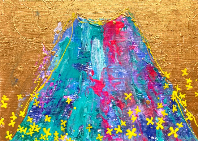「キンモクセイ富士」 原画・一点物 ♦ アクリル絵具・ヒノキ ♦ 2023年9月 ♦ 150×205×40mm ♦ 裏に紐があるのでかけて飾るか、厚みがあるのでそのまま置いても飾れます 山のエネルギーと 香るキンモクセイ。 香りの記憶と 湧いてくるわくわく。