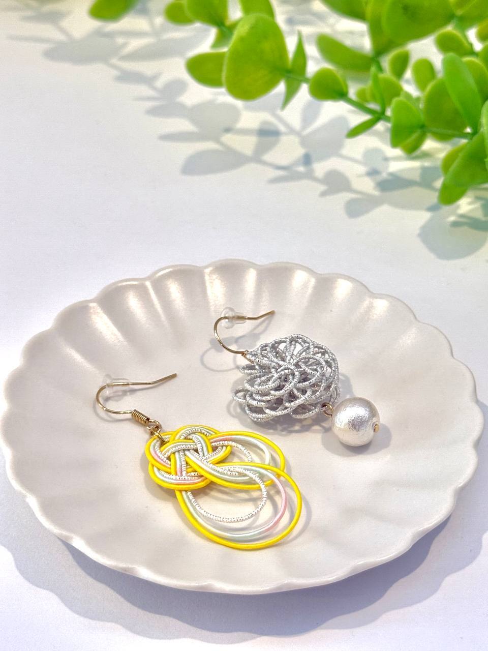 水引きアクセサリー・ピアス・イエロー&シルバー【1点物】