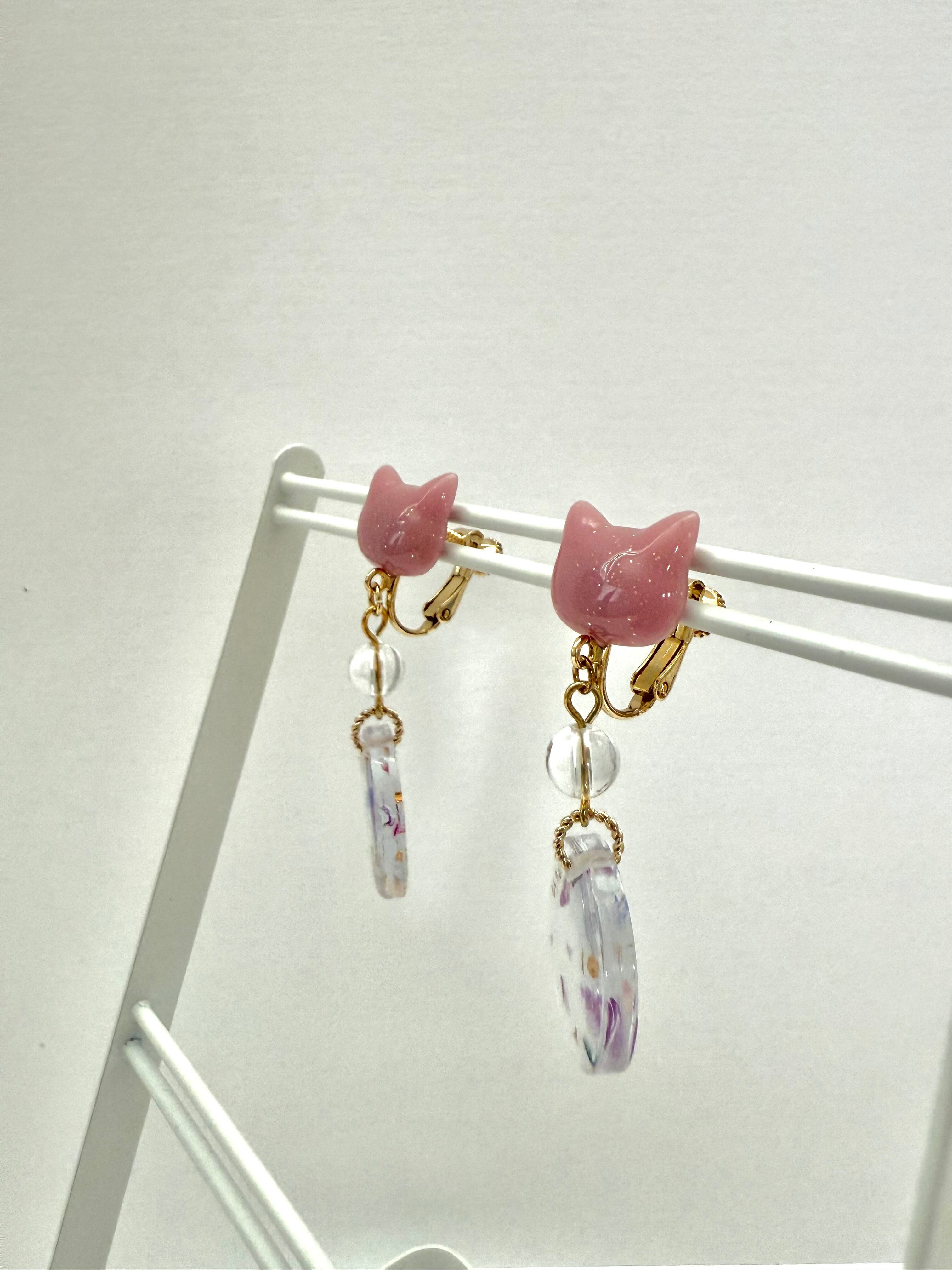 天然石アクセサリー(ねこちゃん)・イヤリング・ピンク【1点物】